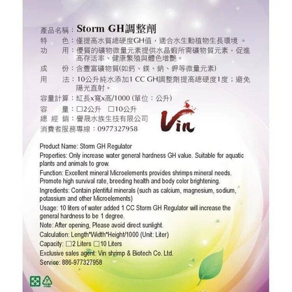 Vin Storm GH Regulator verhoogt alleen de GH, zonder dat de kH en pH worden beïnvloed. Dit maakt Vin Storm GH Regulator bijzonder geschikt voor aquariumplanten en garnalen. Storm GH Regulator bevat de juiste micro-elementen voor een optimale groei en kleuring van uw garnalen. Tevens verhoogt Storm GH Regulator de overlevingskansen van jonge pasgeboren garnalen.
